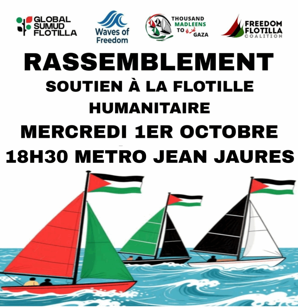 📍 Mercredi 1er octobre à 18h30 – Métro Jean Jaurès, Toulouse – Rassemblement de Soutien à la flottille pour Gaza