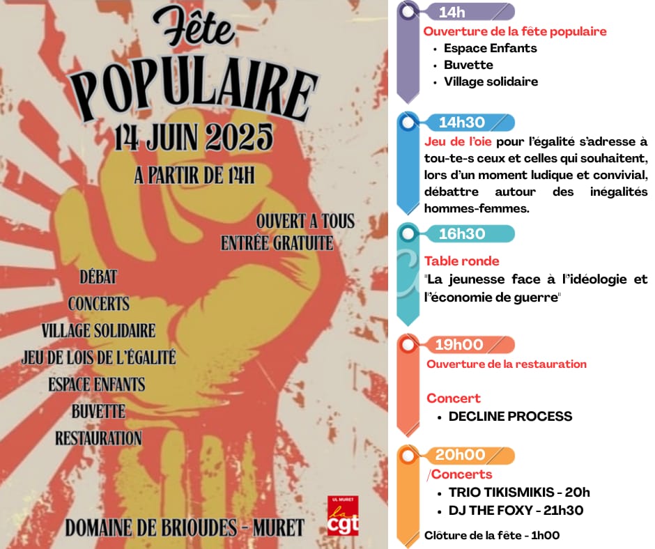 L’Union Locale CGT Muret organise sa 3eme fête syndicale et revendicative le samedi 14 juin 2025 à partir de 14h à Muret (Base de Loisirs de Brioudes).